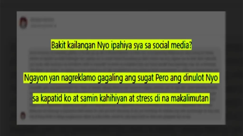 Atungal nito, bakit daw kailangan pang ipahiya ang kaniyang kapatid sa programang Help Desk sa telebisyon at social media. Ang sugat umano ng binugbog na sekyu ay madaling gumaling subalit ang kahihiyan at stress umano ng kanilang kapatid ay hindi na makakalimutan.