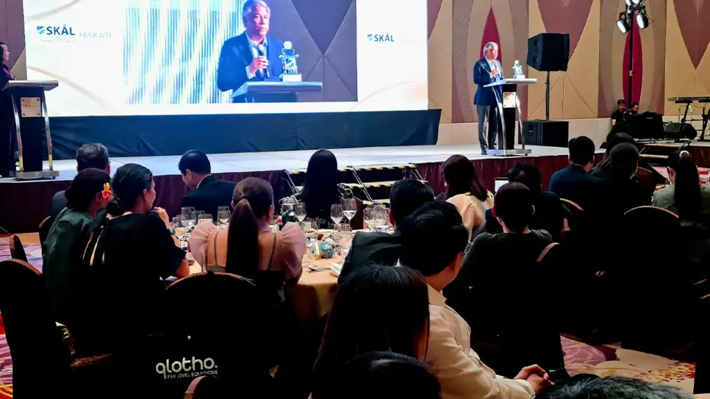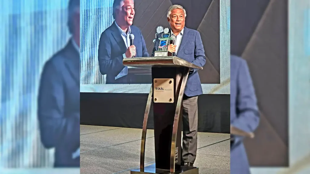 PAGCOR Chairman and CEO Alejandro Tengco delivers his acceptance speech at the 32nd Skål International Makati Tourism Personality Awards on February 26, 2026.