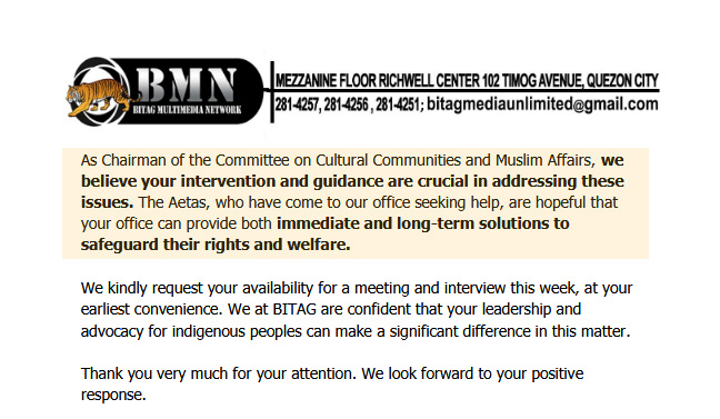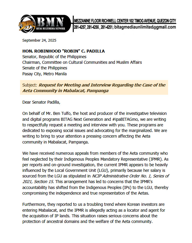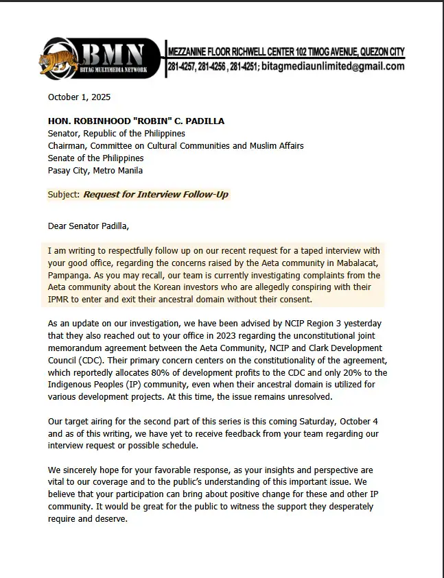 Sinubukan rin ng BITAG na makipag-ugnayan sa tanggapan ni Sen. Padilla para sa solusyon at tuldukan ang mga hinaing ng mga katutubo. Habang sinusulat ang artikulong ito, hindi pa pinaunlakan ni Sen. Padilla ang aming imbitasyon na interview o dayalogo kasama ang mga katutubo. Simula a-24 ng Setyembre 2025, isang buwan na ang nakalipas, dalawang sulat na ang pinadala ng BITAG at panawagan sa mga programa sa telebisyon – tikom pa rin ang bibig ng Committee on Cultural Communities and Muslim Affairs.