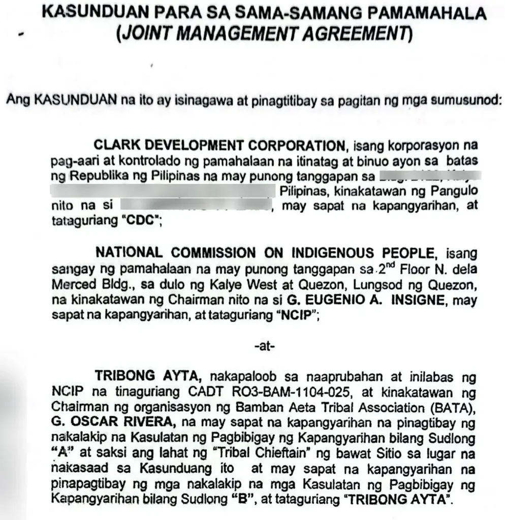 Ang Joint Management Agreement (JMA) ng Tribong Ayta Aeta sa Mabalacat, Pampanga, NCIP Region 3 at Clark Development Corporation (CDC). Nasasaad sa kontrata na ang CDC ang siyang mamamahala at maga-apruba ng mga proyektong papasok sa loob at ookupa ng Ancestral Domains ng mga katutubo. Kaya naman, 80% ng kita sa mga proyektong ito ay mapupunta sa CDC at tanging 20% lamang ang ibabayad sa mga Aeta.